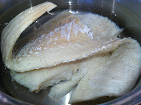 First take your salted cod (Boneless) and re-hydrate it in cold water for at least 24 hours. Changing the water every 12 hours or so.