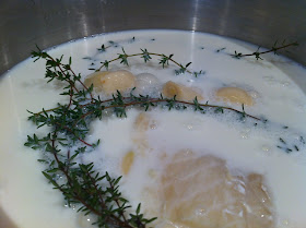 After the cod is hydrated place it in a large pot with a handful of fresh thyme, 6-10 Whole Garlic Cloves and cover in 2% Milk. Bring to a light simmer and allow to gently cook until the cod starts to flake apart.
