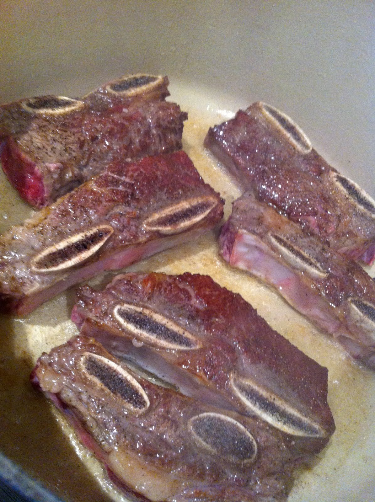 In a large heavy bottomed cast iron dutch oven, add 2 Tbsp of Canola oil and Brown your seasoned (salt & pepper) short ribs (I had about 10 Large pieces) over medium high heat. Make sure you brown on all sides.